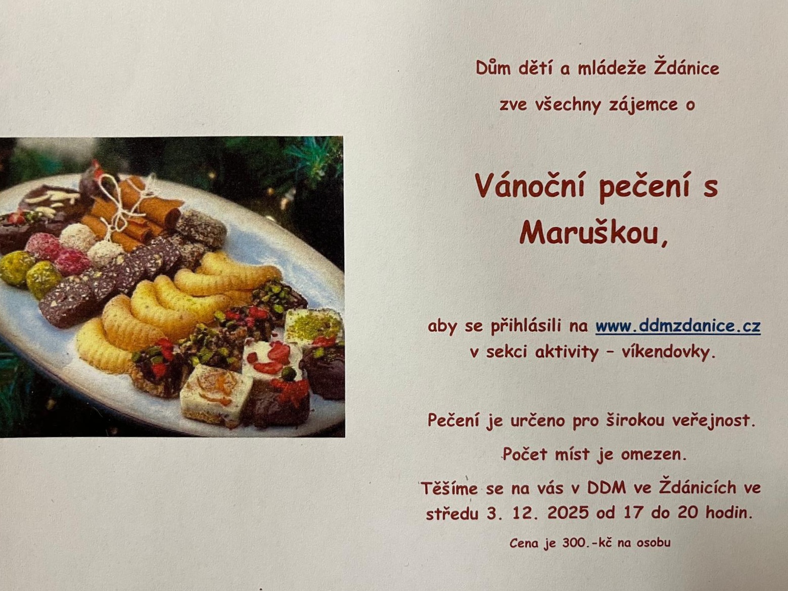 Líbilo se Vám zdobení perníčků o víkendu u nás na DDM s Maruškou, pak neváhejte a přihlaste se na kurz pečení vánočního cukroví, který pro Vás pořádáme již toto středu. Pro další informace nás neváhejte kontaktovat.