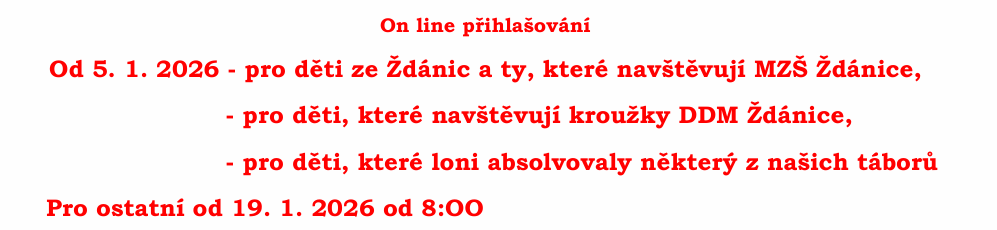 6. ledna otevíráme přihlašování na naše pobytové i příměstské tábory pro děti s trvalým pobytem ve Ždánicích a žáky Masarykovy základní školy Ždánice a děti, které navštěvují kroužky DDM Ždánice.
