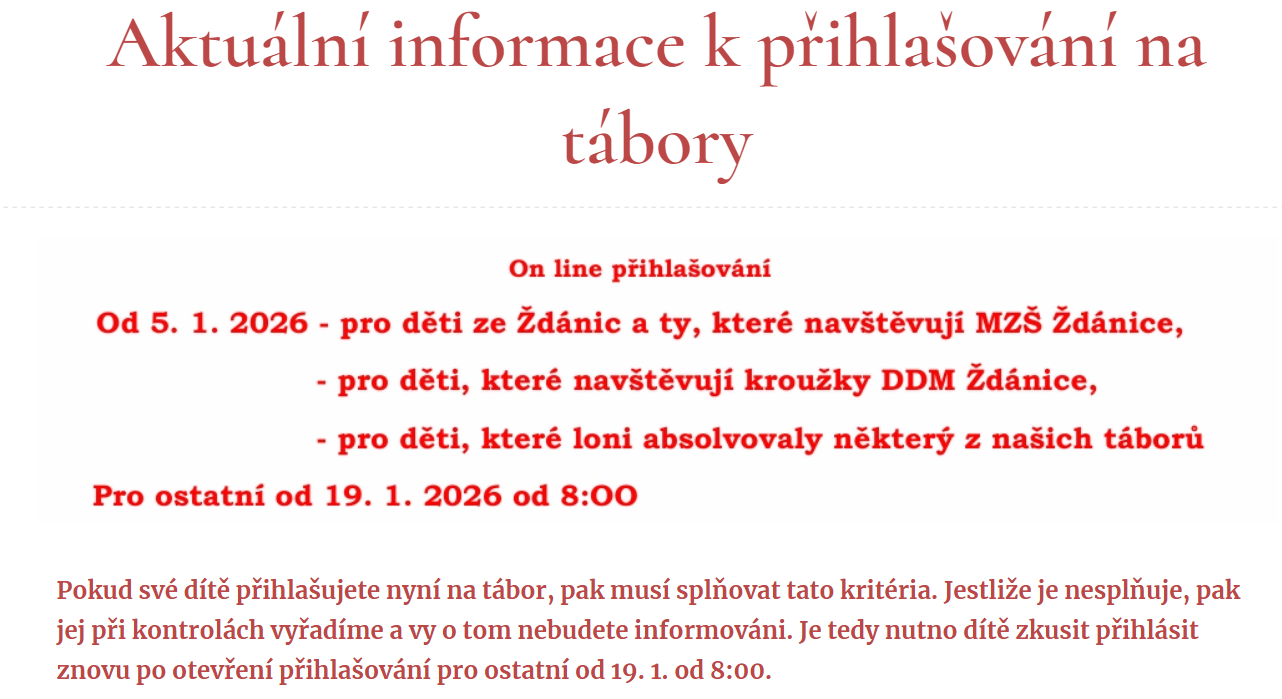 Další důležitou věcí je uhradit celou částku za tábor, převodem na náš účet 107-9294840267/0100, který je také uvedený na papírové přihlášce. Dále Vás chceme informovat, že termín pro uhrazení platby za tábor je do 15. 3. 2026 . V případě nesplnění jedné z těchto podmínek bude místo vašeho dítěte postoupeno dalším zájemcům v druhém kole přihlašování v měsíci březnu. Pokyny k platbě naleznete na přihlášce a na /www.ddmzdanice.cz/.